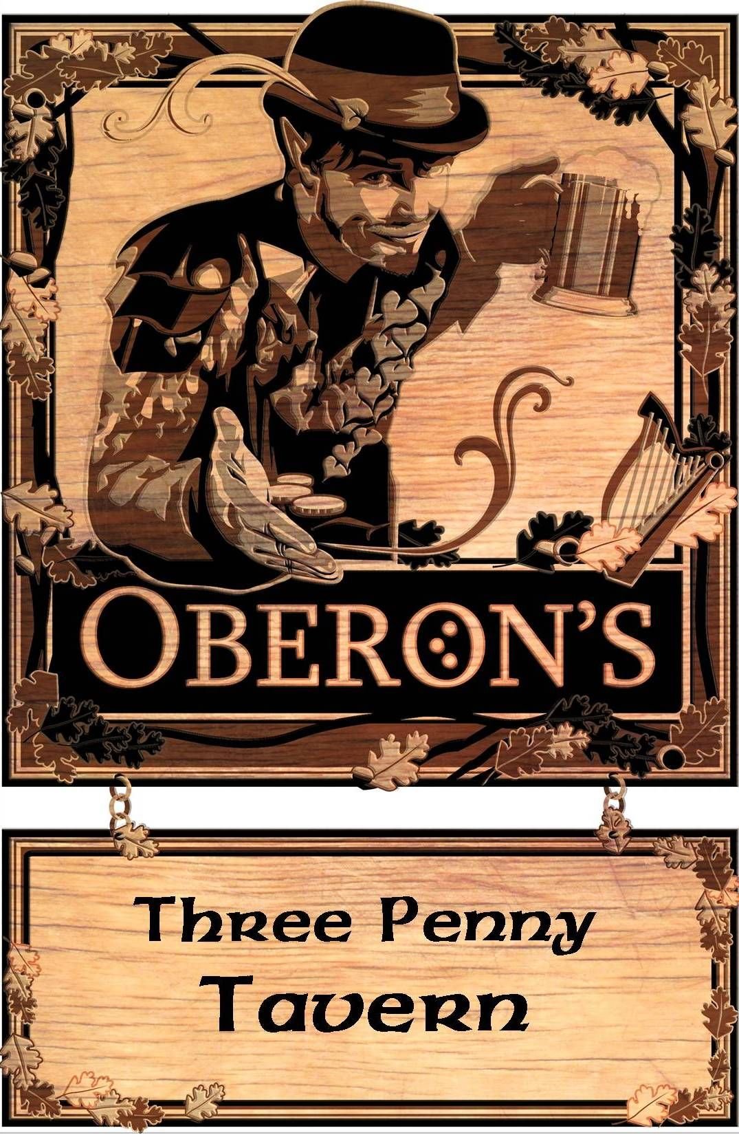 The craftsmanship suggested by the graphic mimics multi-layered woodcarving. The use of varying wood grains—from the light, honeyed tones of the background to the deep, charred ebony of the borders—creates a sophisticated visual hierarchy. The intricate “chip-carved” appearance of the oak leaves framing the scene adds a tactile quality, suggesting that the sign was birthed from the very forest Oberon rules.